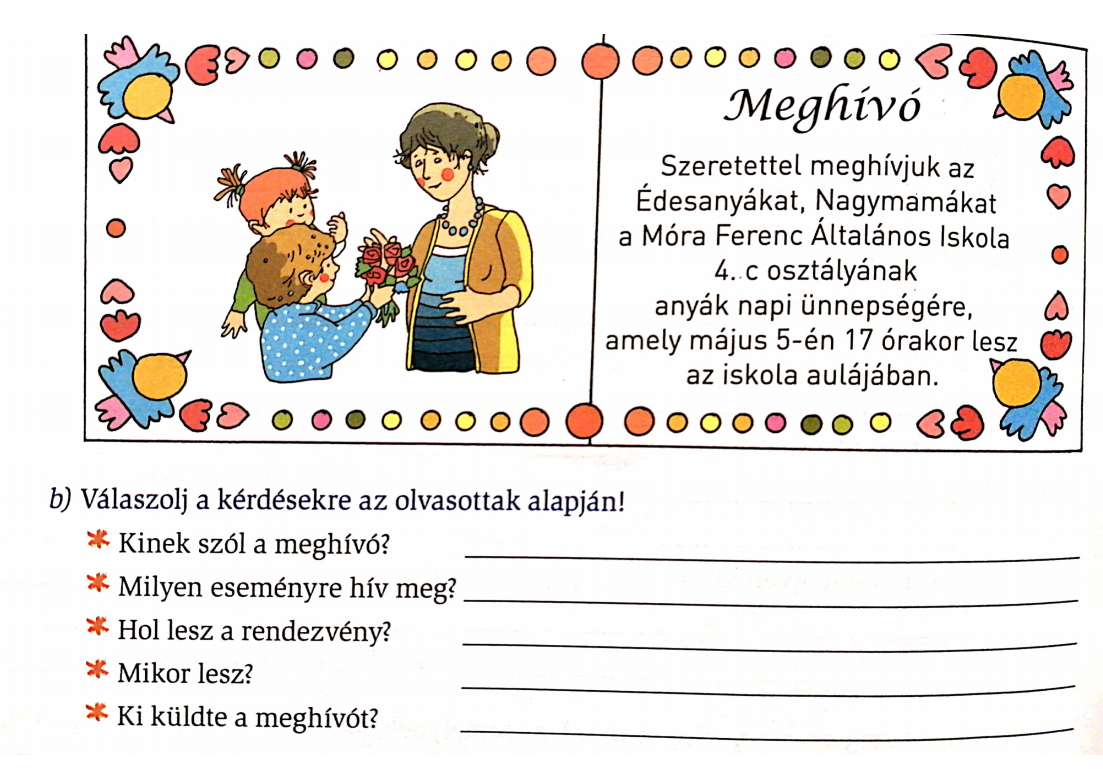 Nyisd ki a Munkafüzetedet a 68. oldalon! Olvasd el az 5. feladat a) részében látható meghívó szövegét! Az olvasottak alapján oldd meg a b) feladatrészt!